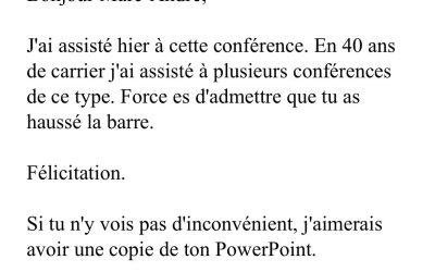 Voici un commentaire reçu par un DG hier suite à la conférence 𝐒𝐲𝐬𝐭é𝐦𝐚𝐭𝐢𝐬𝐞𝐫 𝐥𝐞 𝐬𝐮𝐜𝐜è𝐬 𝐨𝐮 𝐥'é𝐜𝐡𝐞𝐜 𝐞𝐧 𝐒𝐒𝐓. Si vous souhaitez faire vivre la même expérience, ainsi que d'importantes prises de conscience par rapport à la gestion de la SST à vos équipes...